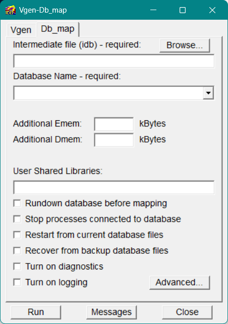 Use the Messages button at the bottom of the Vgen-Db_map dialog to access the Message List window.