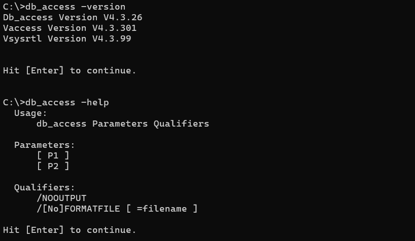 WIN If you use these qualifiers on a graphical program like db_view or vdraw, you will get an additional window. You will need to hit the Enter key to close the window. Even for the command line programs, you will need to hit Enter.